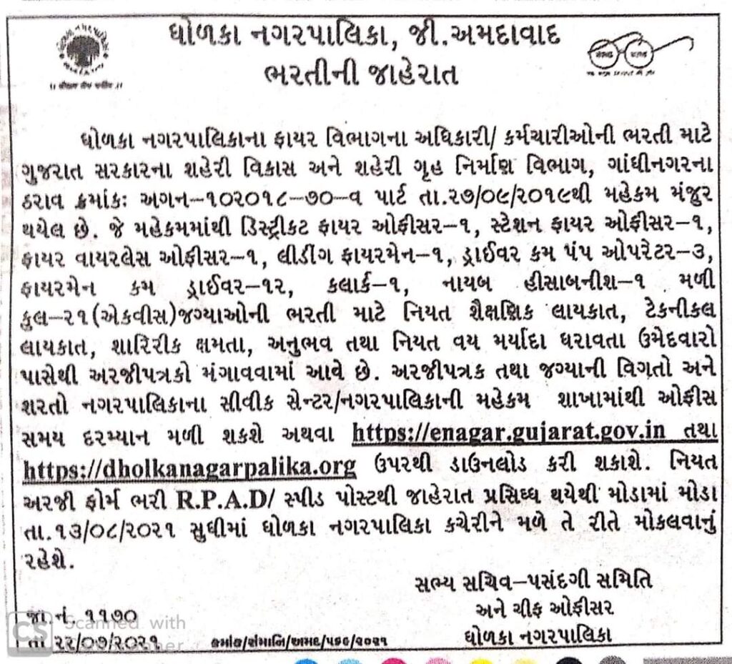 Dholka Nagarpalika Recruitment 2021 : Dholka Nagarpalika published an official notification for Recruitment of Clerk, Dy. Accountant, Fire Officer, Driver cum Pump Operator posts. Eligible candidates can apply for this recruitment. You can view more details about this recruitment including No. of posts, name of post, Educational qualification, Age limit, Selection process, How to apply etc… You can also view official notification and other important facts about this recruitment e.g. Important links and Important dates.