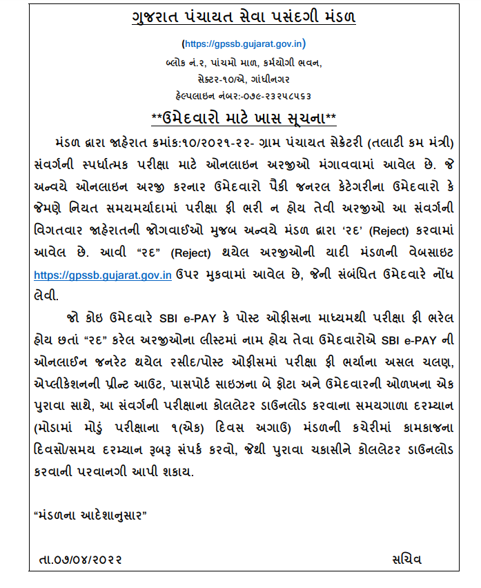 | GPSSB Talati Rejected Application List 2022 | Click Here |