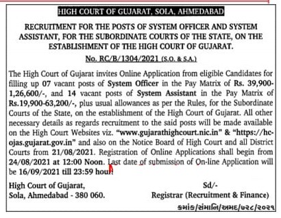 Gujarat High Court System Officer and System Assistant Recruitment | High Court of Gujarat Recruitment for 21 System Officer and System Assistant (HC OJAS)  Eligible Candidates advised to refer to the official advertisement and apply for this post. You can find other details like age limit, educational qualification, selection process, application fee, and how to apply are given below. Keep checking SarkariMahiti.Com regularly to get the latest updates. post, Educational qualification, Age limit, Selection process, How to apply etc…