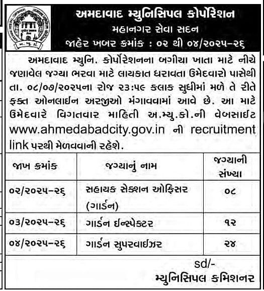 AMC Recruitment 2025: The Ahmedabad Municipal Corporation (AMC) has released an official notification (Advertisement No. 02 to 04/2025-26) inviting online applications for various posts in the Garden Department. Eligible candidates can apply by 08 July 2025 (11:59 PM) through the official AMC website.
