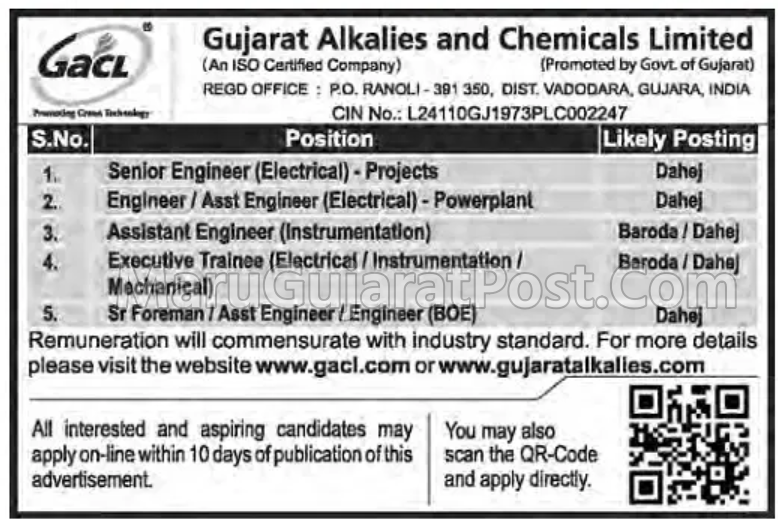 GACL New Bharti 2022 | Gujarat Alkalies and Chemicals Limited ( GACL ) Recruitment For Executive Trainee , Senior Engineer & Assistant Engineer Post 2022,Candidates who are seeking Gujarat Govt jobs must check their eligibility i.e. educational qualification, age limit, experience and etc. GACL recruitment process will be based on written test/ interview. Selected aspirants will be placed at [ Baroda / Dahej ].