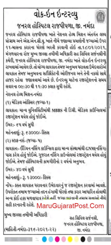 General Hospital Rajpipla Recruitment 2022 | Rajpipla Civil Vacancy notification declare for Medical Officer & Staff Nurse Posts. General Hospital Rajpipla has publish notification for Various Posts. Candidates with suitable qualifications for the purpose of recruiting For the period and making a waiting list. You can find other details like salary, age limit, procedure, Last date, educational qualification, and how to apply are given below. Keep checking marugujaratpost regularly to get the latest updates.