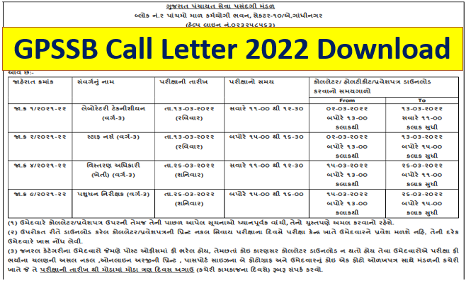 GPSSB Call Letter 2022 Download : Gujarat Panchayat Service Selection Board ( GPSSB ) Laboratory Technician Exam, Staff Nurse, Extension Officer (Agriculture), Divisional Accountant, Live Stock Inspector, Statistical Assistant, Deputy Accountant, Junior Pharmacist, Social Welfare Inspector (Junior Grade) , Extension Officer (Co-Operation) On March – April & May 2022