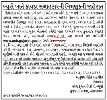 Gujarat Anti Corruption Bureau Bharti 2022 : ACB Gujarat Anti Corruption Bureau Bharti for Law Advisor Posts 2022 | ACB Gujarat Bharti 2022 | Apply For 03 Legal Advisor Post. Jobs in ACB Gujarat Vacancies: Recently Anti Corruption Bureau Gujarat Has Released a Job Notification on acb.gujarat.gov.in ACB Gujarat Employment News 2022 | ACB Gujarat. Job Openings in Anti Corruption Bureau Gujarat | Latest News ACB Gujarat Free Job Alert 2022. Jobs Vacancy ACB Gujarat Notification | ACB Gujarat Vacancy in Gujarat | Gujarat Govt Jobs ACB Gujarat Bharti Notification 2022.