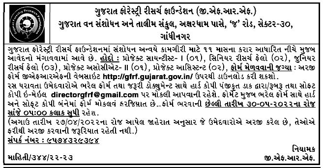 Gujarat Forestry Research Foundation Bharti 2022 | GFRF Recruitment 2022 Gujarat : Gujarat Forestry Research Foundation(GFRF) published an official notification for Recruitment of Variuous posts. Eligible candidates can apply for this recruitment. You can view more details about this recruitment including No. of posts, name of post, Educational qualification, Age limit, MaruGujaratPost, Selection process, How to apply etc…