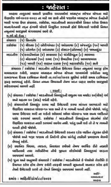 MDM Ahwa Bharti 2022 | MDM Ahwa Recruitment 2022 | Mid Day Meal (MDM), Ahwa Vacancy Sanchalak, Rasoiya and Madadnish Posts.2022 Eligible candidates are advised to pass on the approved advertisement and use for this post. You can find other facts about the container such as old growth limit, doctrinal qualification, MaruGujaratPost medley procedure, device fee and how to place it agreed below.