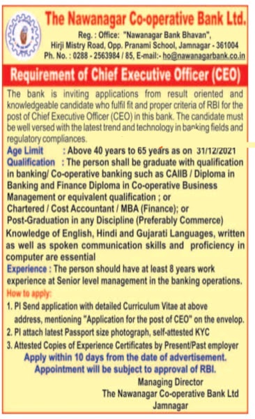 Nawanagar Bank Recruitment 2022 : The Nawanagar Co-Operative Bank, Jamnagar published an official notification for Vacancy of Chief Executive Officer (CEO) post. Eligible candidates are advised to pass on the approved advertisement and use for this post. You can find other facts about the container such as old growth limit, doctrinal qualification, medley procedure, device fee and how to place it agreed below.