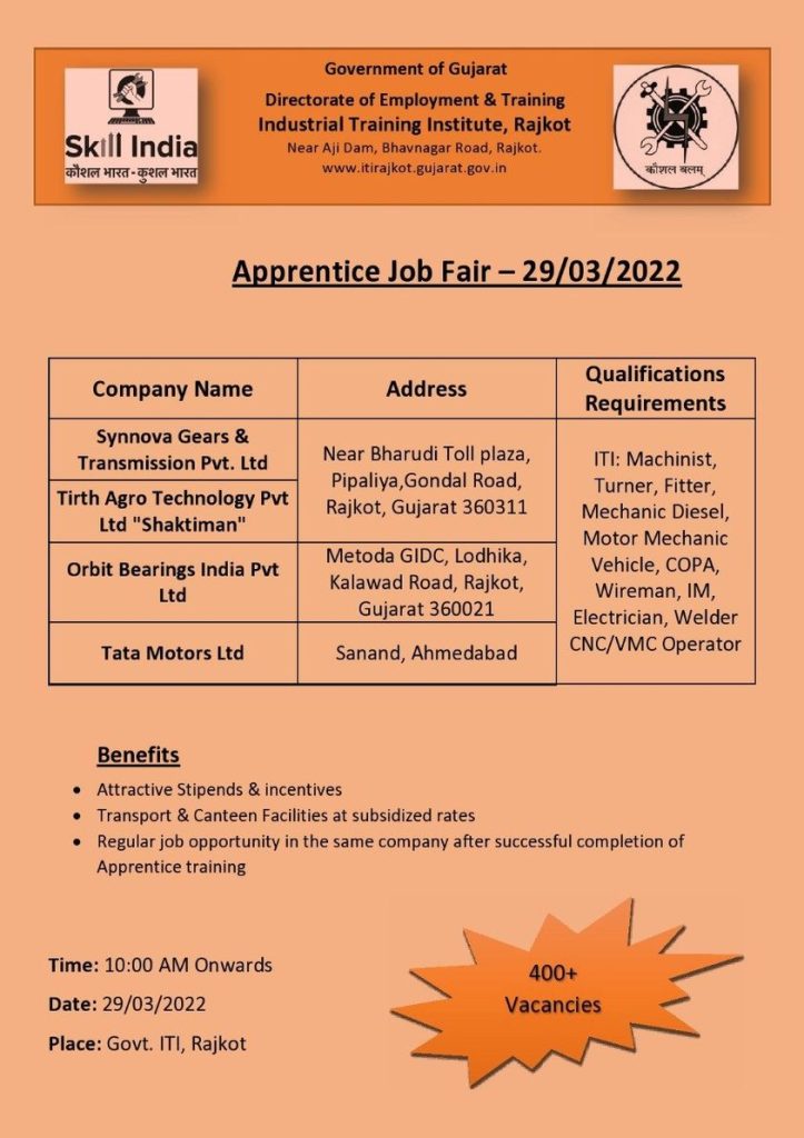 District Employment Exchange Office, Rajkot & Ahmedabad published an official notification for Recruitment of Apprentice Bharti Mela 2022. Rozgaar Bharti Mela 2022