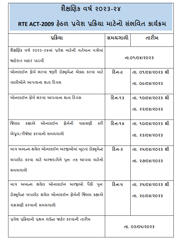 Children who have applied for admission in Std-1 under RTE and have not completed 6th year of age on the date of admission will not normally be admitted in primary school. However, if a child wants to be admitted at the age of six, he will be admitted, but he must have completed six years of age on June 1 2023 of that year.