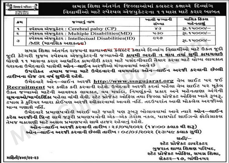 SSA Special Educator Bharti 2022 Gujarat | Download Notification | Eligibility | Last Date