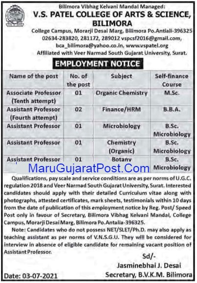V S Patel College Bilimora Recruitment : V.S.Patel College of Arts & Science Managed by Bilimora Vibhag Kelavani Mandal. they Published Employment Notice For Assistant Professor Vacancies. New Professor Job Released in Navsari. Invites Applications From Eligible Candidates Within 10 Days by Reg. Post/ Speed Post.