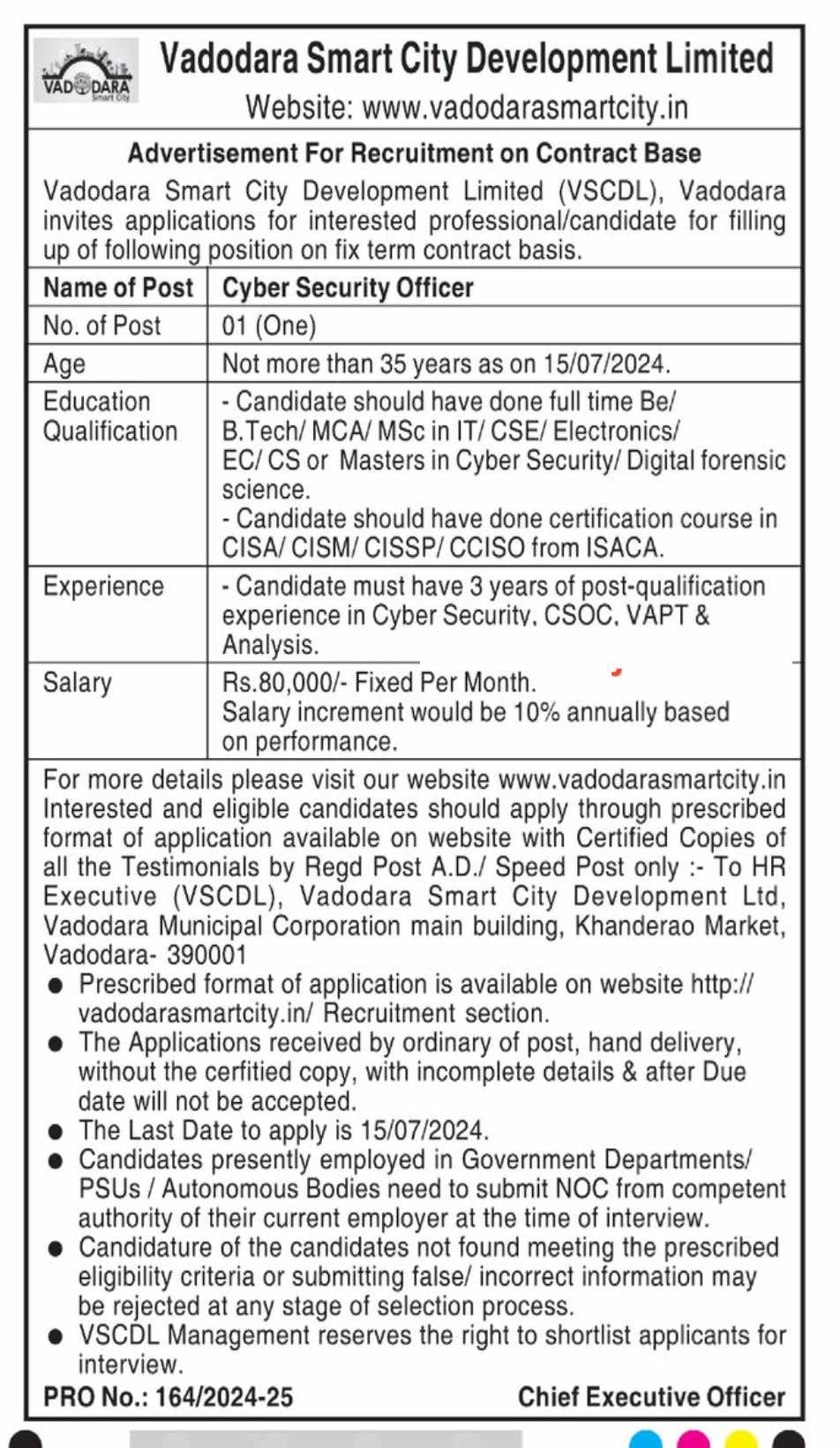 VSCDL Bharti 2024 : Vadodara Smart City Development Limited (VSCDL) Published an official notification for Vacancy of Cyber Security Officer Posts.2024a