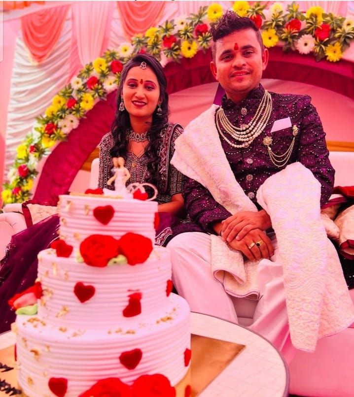 નીતિન જાની આ તસવીરમાં ફોટામાં ત્રણ લેયર માં સગાઇ ની કેક જોવા મળી રહી છે